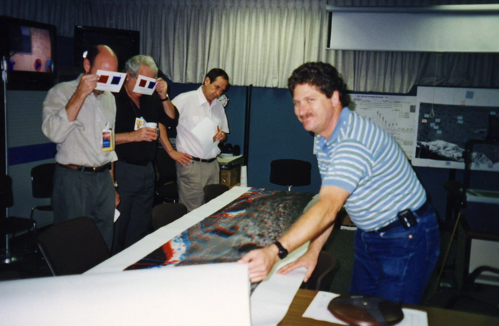Kris Capraro shows members of the Caltech Board of Trustees Mars in 3D from Mars Pathfinder mission images, using their red/blue glasses to view an anaglyph produced by our software